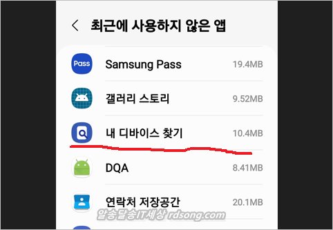 디바이스케어 > 램RAM 터치 > 최근에 사용하지 않는 앱 , 내 디바이스 찾기 올라 옵니다.