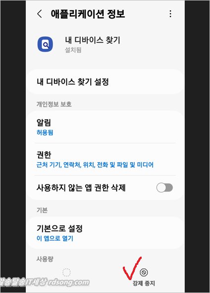 내 디바이스 찾기 앱 터치 하면 애플리케이션 정보 나오고 아래 하단에서 강제중지 시킬수 있습니다.