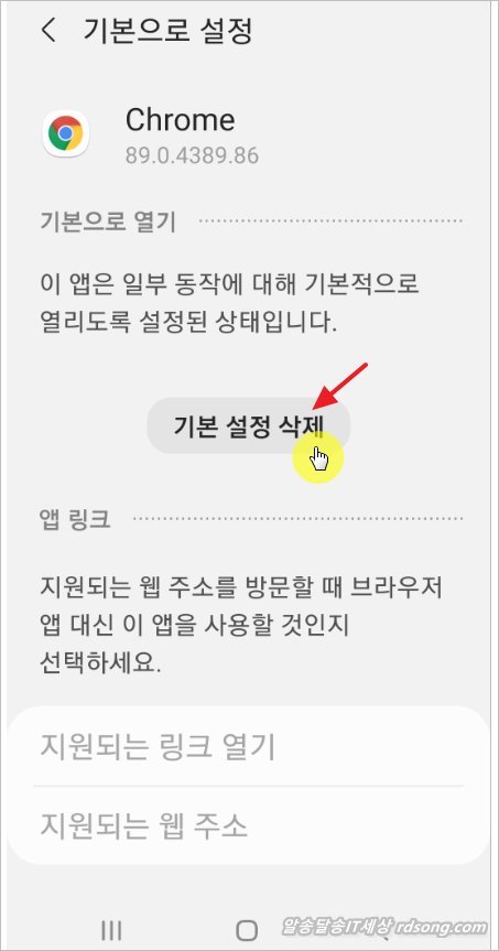 그러면 chrome 에서 기본설정 삭제 터치 합니다.  이앱은 일부 동작에 대해 기본적으로 열리도록 설정 된 상태 입니다 라 라고 되어 있는데 터치 합니다. 그러면 기본을 사용하지 않았습니다 라고 기본설정 삭제 처리가 됩니다.