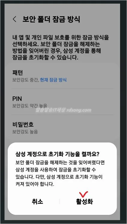 갤럭시 보안폴더 삼성계정 초기화 기능 켤까요?