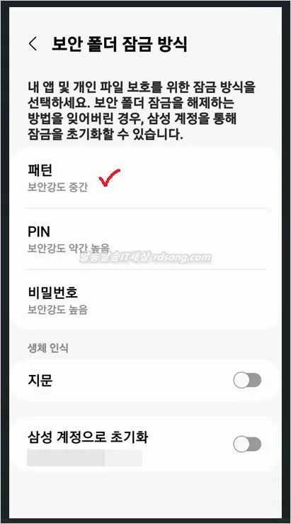 내 앱 및 개인 파일 보호 위해 잠금방식 선택 합니다.