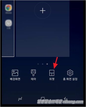 갤럭시 홈화면 위젯 설치를 하려면 , 홈화면의 빈공간 적당한 곳을 길게 터치 하면 아래처럼 화면 나옵니다