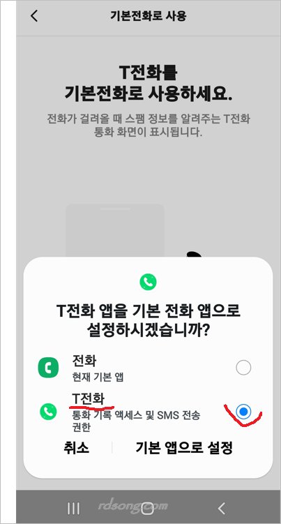 티전화 앱을 열고 , 설정 > 기본전화로 사용 체크 하면 됩니다.