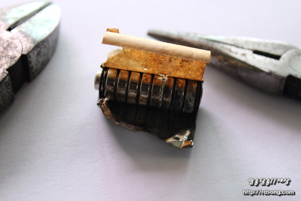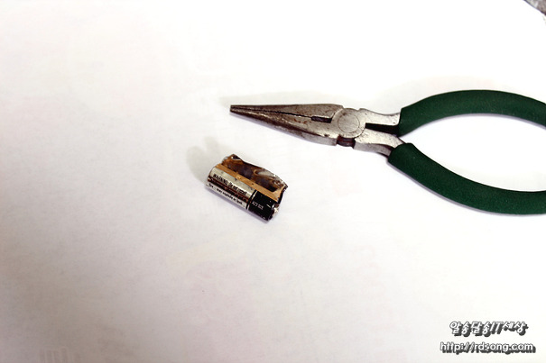 건전지 A23 표면을 감사고 있는 얇은 철판을 벗기면 됩니다 간단합니다 날카로와서 롱로우즈와 닛퍼를 이용하여 분해 했습니다