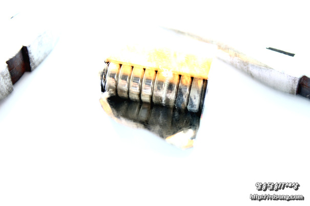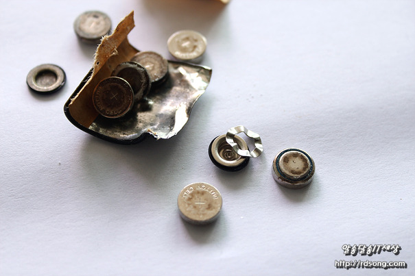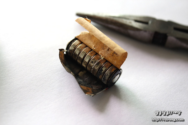 A23 건전지 내부 12V 분해를 해보니 오호~ 수은전지 8개가 직렬로 촘촘히 쌓여 있는데요 사용한지 오래 되어 부식 및 건전지 작동이 부실했던 이유는 우측에 있는 수은전지 4개 정도가 맛이 갓습니다 희미한 전류나마 리모컨 램프가 약하게 점등은 되었기 때문입니다.