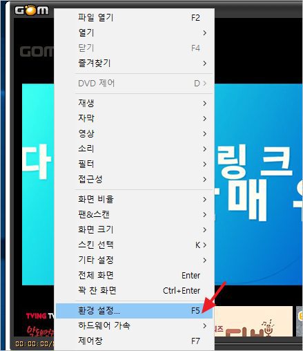곰플레어어에서 마우스 우측 버튼을 누르면 환경설정 에 갑니다
