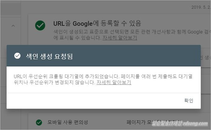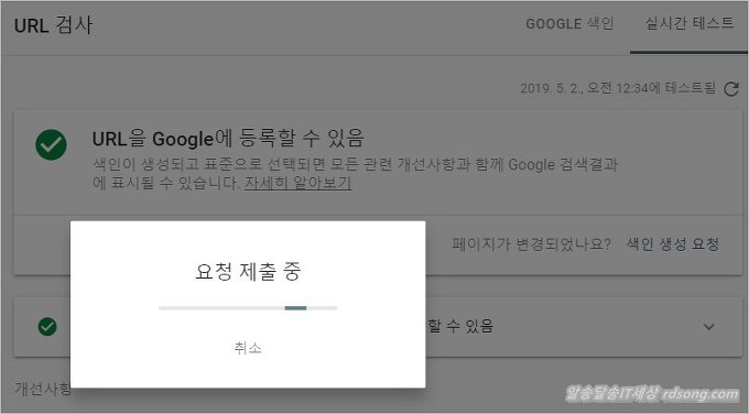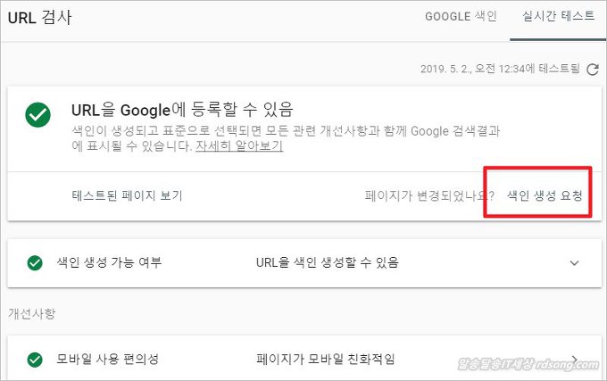 귀찮다면 우측하단 그냥 [ 색인생성 요청 ] 을 눌러 된다 그러면 실제 url 테스트 거치고 색인을 생성한다 즉 구글 검색엔진에 등록을 하는 것이다