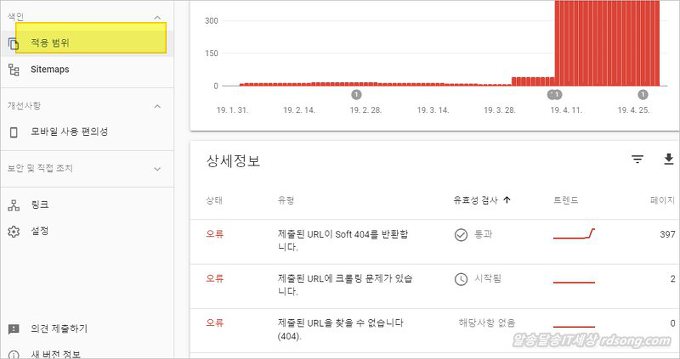 구글 서치 콘솔 접속하면 좌측 화면의 [ 적용범위 ] 및 [ 모바일 사용 편의성 ] 문제가 있다면 즉시 해결을 해야 한다