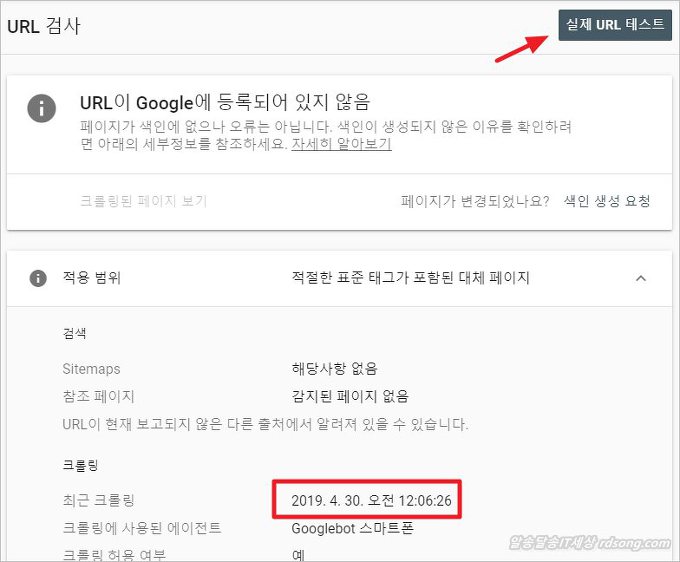 url이 google 등록되어 있지 않음 ! 이건 바로 구글검색엔진 색인이 되어 있지 않은 상태이이므로 ‘ 실제 URL 테스트’ 눌러 보면 구글 검색엔진이 색인이 가능한지 검사를 하게 된다