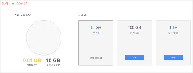기본적으로 15GB는 무료로 제공이 되지만 100GB는 유료로 월 1.99달러 , 1TB사용은 9.99달러 입니다