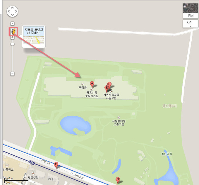 구글지도를 열어보면 좌측에 노란 사람을 마우스로 드레그하여 지위로 올려 놓으면 파란색으로 나타난 라인들이 구글뷰로 볼수 있는 곳들입니다