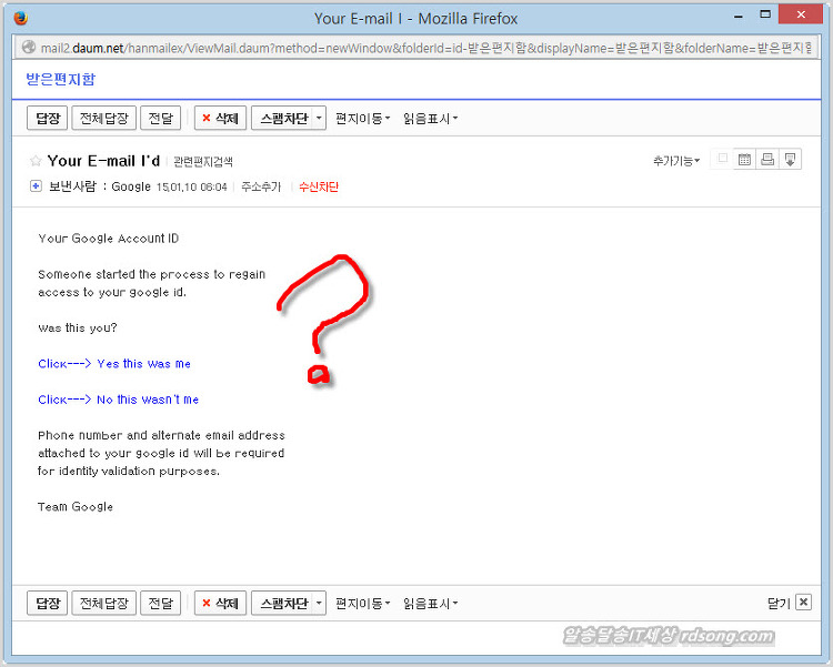 구글에서 온 메일이라고 열어 봤다가는? 구글을 빙자한 의심스런 링크는 열지 말고 삭제.