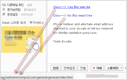 내 구글 계정을 누군가 접근했다고 링크가 걸린 곳 확인을 하라는데, 마우스로 링크 위를 올려 보면 어디로 링크가 연결되어 있는지 볼수 있을 겁니다