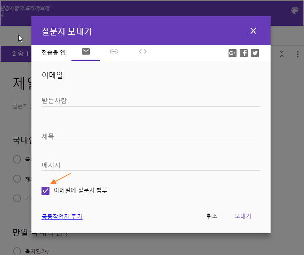 모두 작성이 되었으면 설문지 보내기를 하여 받는사람에게 설문지를 첨부하여 발송하면 됩니다