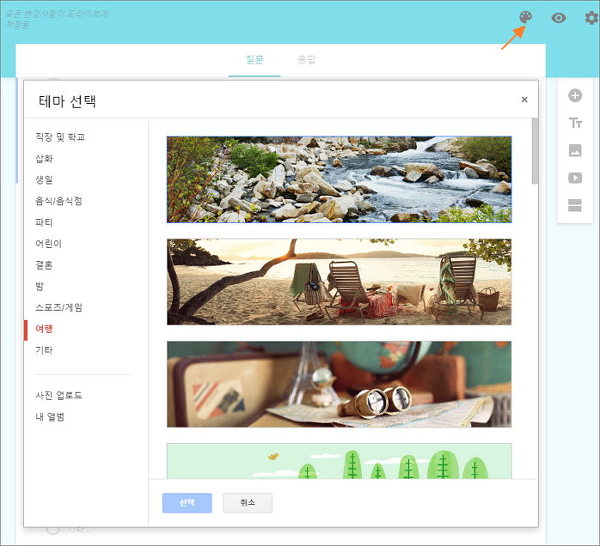 우측 상단에서 원하는 테마로 변경 할수 있습니다 설문하는 것이므로 뭐니 뭐니 해도 최대한 심플한 스타일이 좋습니다 그건 사용하는 사람 선택 입니다