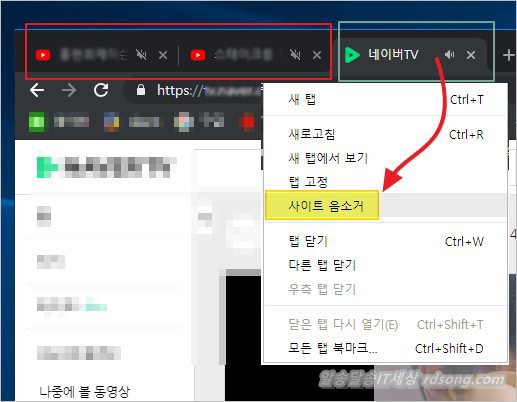 크롬 사이트 음소거는 탭에서 쉽게 음소거 / 해제를 쉽게 할수 있는데 만약 동일한 사이트 탭 여러개를 띄웠을 경우 모두 음소거 됩니다