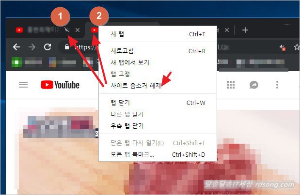 재생되고 있는 유튜브 탭 위에서 마우스 우측을 눌러 사이트 음소거를 할수 있고 사이트 음소거 해제가 되는데 2개 열린 모든탭까지 동작합니다