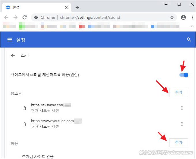 아래 사이트에서 소리를 재생하도록 허용이 되어 있는데 끄게 되면 크롬에서 소리가 나지 않습니다