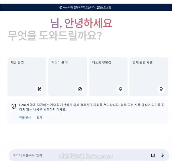 아래 프롬프트 입력 창에 질문을 입력하면 바로 답변을 해 줍니다. 상단의 업데이트 내용 보기 보면 gemini 업데이트 상태, 자세히 살펴 볼수 있습니다.