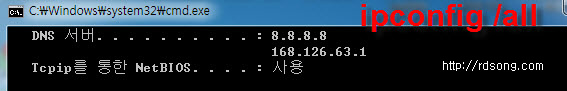 내컴퓨터 에서 제대로 공유기의 DNS 값이 적용이 되는지 확인을 해 봅니다