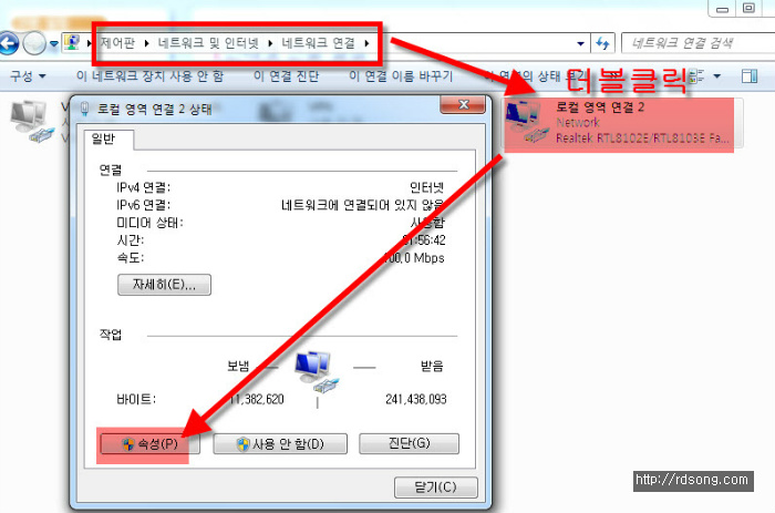 아래 제어판에 가서 네트워크및 인터넷 연결에 가면 로컬영역연결에서 수정을 하는데요 윈7에서는 제어판 메뉴설명이 화면 캡처 귀차니즘으로 윈도우 7의 GOD MODE 갓모드 만들어 놓으면 제어판 설정화면 찿기가 훨씬 편리합니다