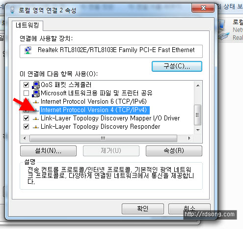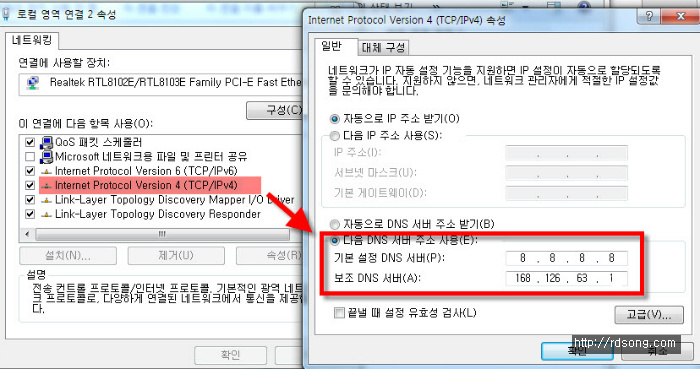 internet protocol version TCP-IP v4 를 선택하고 아래처럼 , 기본설정 DNS서버와 보조 DNS 서버를 각각 입력하면 됩니다