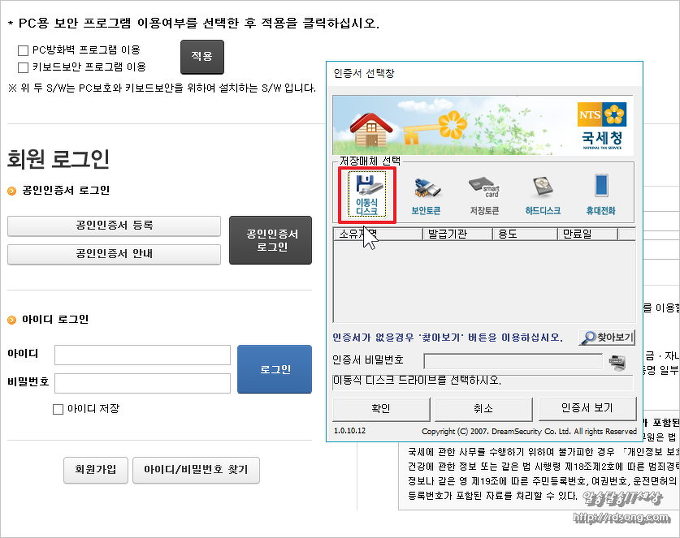 컴퓨터에 usb메모리를 꽃고 공인인증서 로그인을 하면 ‘이동식디스크‘를 마우스로선택 합니다