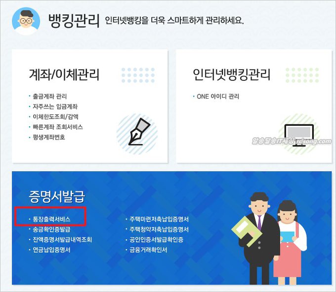 만약 뱅킹관리 클릭하여 들어가면 아래처럼, 증명서 발급 > 통장출력 서비스 이용하면 됩니다. 화면이 약간 다르지만 마지막은 동일한 기업은행 통장사본출력 화면 뜹니다.