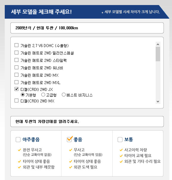 세부 모델과 차량 연식과 차량상태를 선택해 줍니다