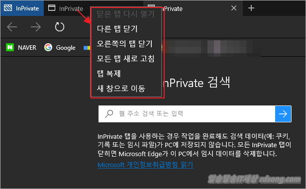 닫은탭 다시 열기, 다른 탭 닫기, 오른쪽의 탭 닫기, 모든 탭 새로 고침, 탭복제, 새창으로 이동 이 있습니다 닫은 탭 다시 열기는 inprivate에서는 사용 불가 입니다 당연하죠 검색기록을 저장하지 않으니 캐시저장소에 관련 정보가 탭을 닫자 마자 사라지니까요