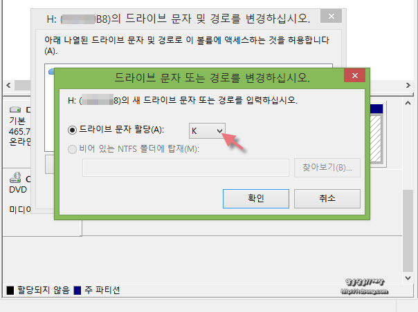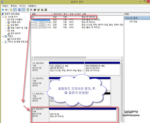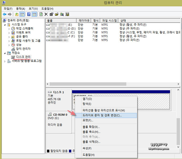 내컴퓨터에 외장하드 인식 볼륨이 나타나지 않을 때,외장하드 드라이브경로 문자 변경 [윈도우8]