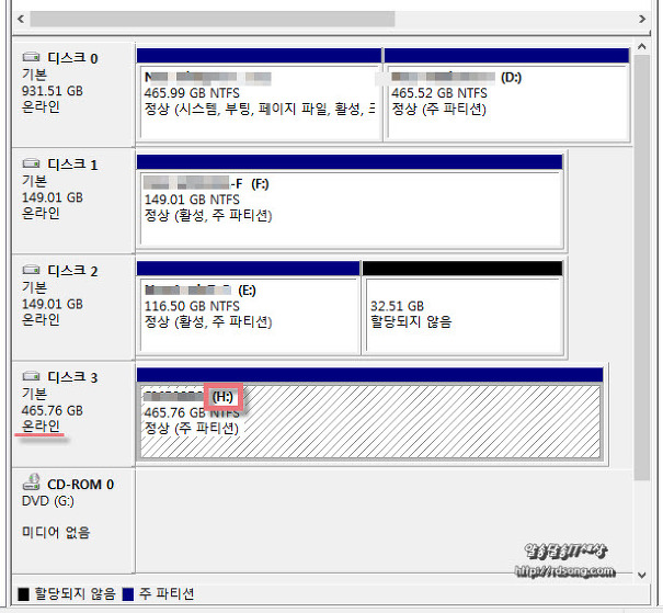 디스크 관리에서 정상적 온라인 상태로 보여야 합니다
