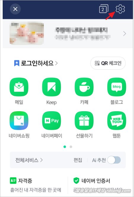 네이버앱 설정 : 좌측상단 메뉴 아이콘 터치 > 우측 상단 톱니바퀴 모양 터치 합니다.