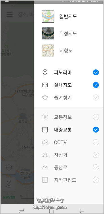 네이버 지도 앱에서는 등산로 정보도 알수 있는데 스마트폰 화면의 우측 상단의 사각형 모양의 아이콘을 눌러 보면 아래 설정에서 등산로를 체크 해줘야 등산길이 네이버 지도에 나타난다