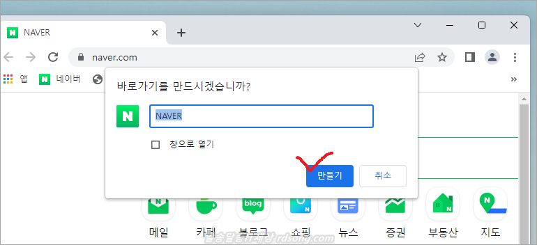 네이버 바로가기 만드시겠습니까? 만들기 눌러 줍니다.