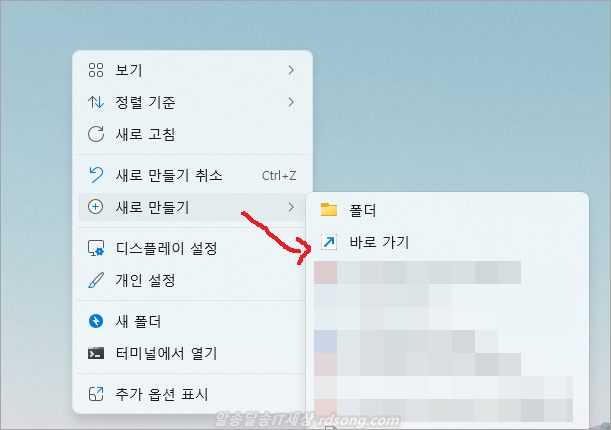 윈도우11 바탕화면 빈곳에 마우스 우측 버튼 눌러 줍니다. 새로만들기 > 바로가기 눌러 줍니다.