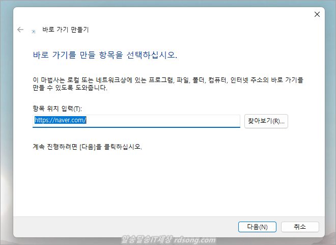항목위치 입력 란에 https://naver.com 입력 하고 다음 진행 합니다.https://www.naver.com 입력 해도 되고 www 빼고 입력 해도 상관 없습니다.