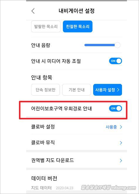 어린이 보호구역 우회 경로 안내 옵션이 있습니다 이것을 ON 시켜 주면 됩니다.