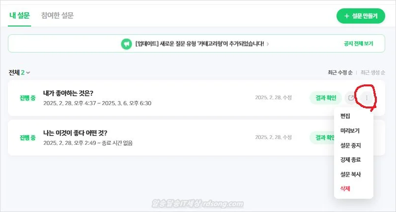 설문조사 중지 , 설문조사 편집, 강제 종료 , 설문 복사 , 설문조사 삭제 할수 있습니다.