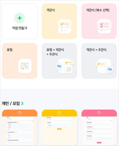 - 주관식 단답형 , 주관식 서술형, 드롭다운, 카테고리형, 점수 선택형