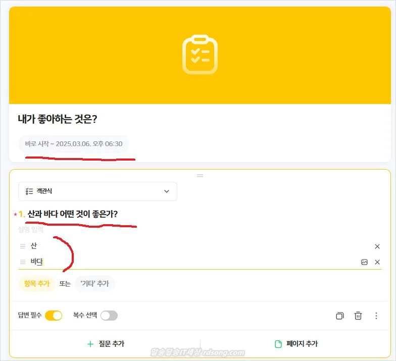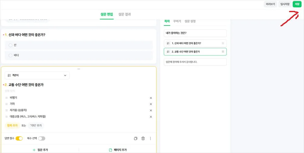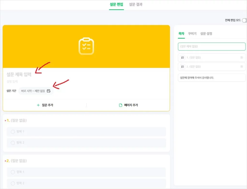 우측 상단의 설문설정 에가서 보면 몇가지 옵션이 나옵니다