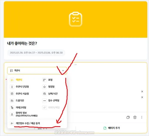 설문유형 에서 개인정보 보호 제공 수집 동의 추가 하면 됩니다.