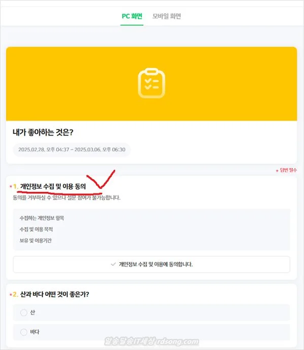 네이버 폼 설문조사 화면으로 보면 , 개인정보 제공동의 하는 항목 나옵니다.