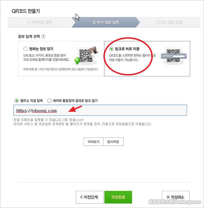 웹주소 URL 입력 합니다. 네이버 통합검색 결과로 링크 연결 할 수도 있습니다. 그런 다음 작성완료 누르면 됩니다.