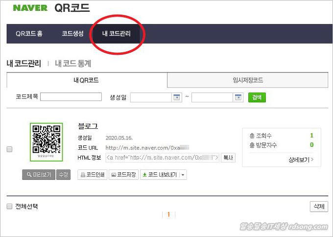 상단의 [ 내 코드 관리 ] 에서 내가 만들어 놓은 qr 코드 수정 및 qr 코드 삭제 관리를 할수 있습니다.