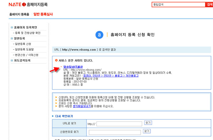 네이트에검색등록을 메일로 신청하고 아래 등록신청확인에서 홈페이지/블로그 검색등록신청 하신것을 볼수 있고