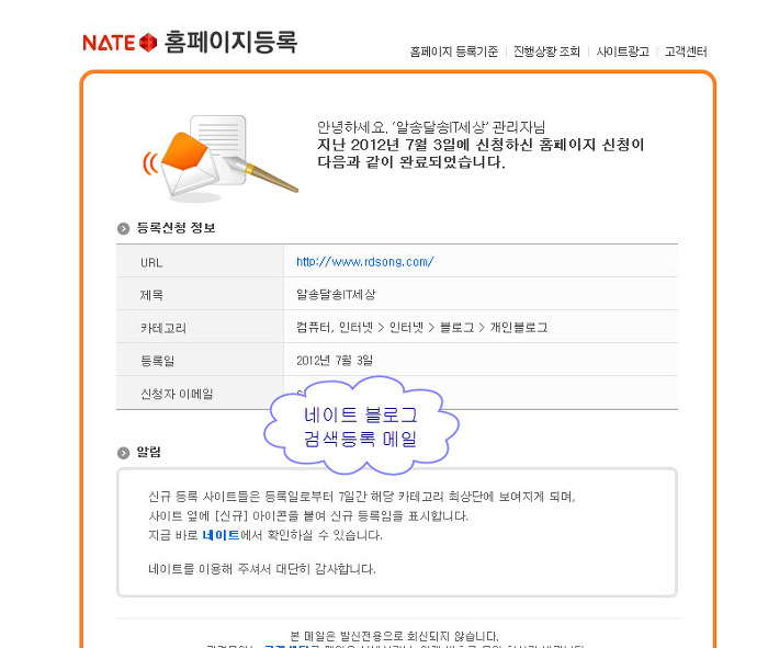 너무 오래 걸려서 혹시 네이트 검색엔진 등록이 안되었나 싶기도 했었는데..다행히 검색등록반영 되었다고 메일이 날라 왔습죠