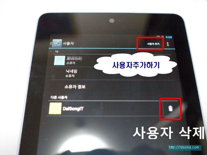 사용자추가를 터치하여 진행하시면 되고요..아래 사진은 이미 사용자를 추가해 놓은 것으로서 다른사용자 우측에 휴지통에 언제든지 넥서스7에 새사용자를 삭제/제거할수도 있습니다