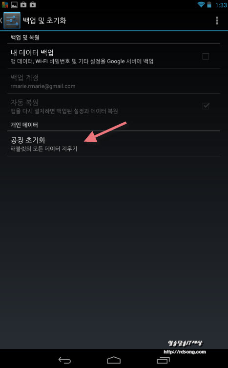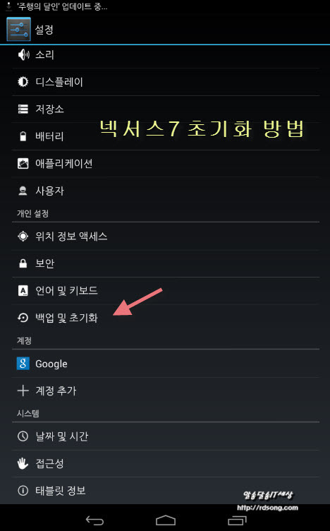 넥서스7의 설정 메뉴에서 백업 및 초기화 로 터치합니다 그러면 공장초기화 ,태블릿의 모든 데이타 지우기로