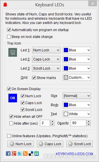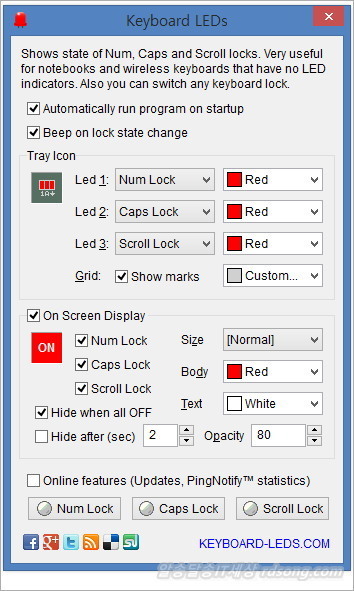 keyboard leds (제작사 홈페이지) 프로그램으로 윈도우 바탕화면 작업표시줄 키눌림 디스플레이 알림 과 윈도우8.1의 caps lock, scroll lock, num lock 키가 눌려졌을 때 소리/비프음 나도록 설정하는 윈도우8.1 팁 이였습니다